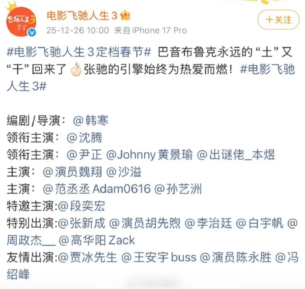 韩寒导演,沈腾主演的电影《驰骋东谈主生3》在春节手艺上映了。