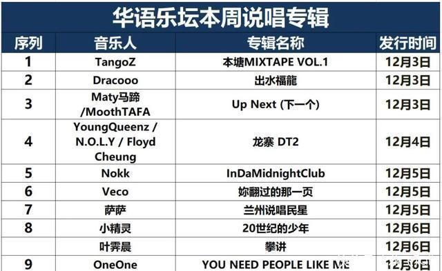 本周说唱歌手再度大爆发,初步统计一周就有11张说唱专辑/EP问世。到了年底,rapper们比职场社畜还要勤奋,看到统计的专辑列表,以至深嗜现时华语乐坛,奈何会出现这样多的说唱歌手。