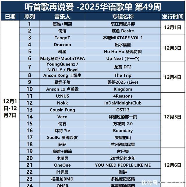 2025年第49周,参加12月之后,华语乐坛再度温暖起来,诸位歌手扎堆赶着出专辑。可以料念念,随后二十多天乐坛还将愈加吵杂,新专辑数量也细目会向上本周。